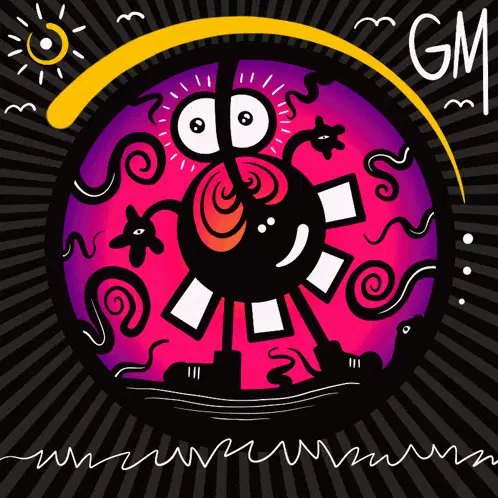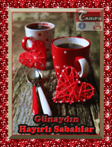 A vibrant good morning greeting card with coffee cups, decorative hearts, and Turkish text.