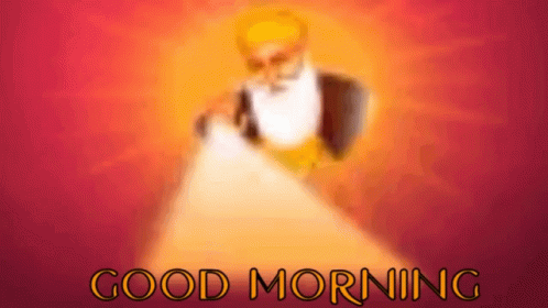 A vibrant image of Guru Nanak Dev Ji with a radiant glow, wishing 'Good Morning'.