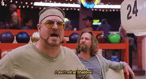 Vintage Yiddish postcard depicting three men, two shaking hands, wishing 'Gut Shabbos' on a street scene.