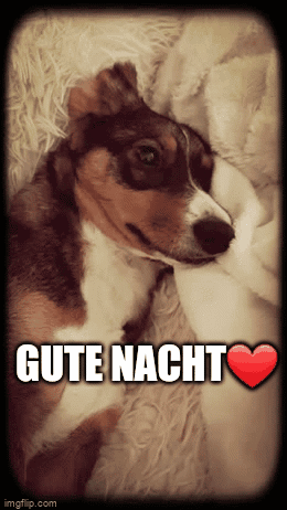 A cute brown and white dog yawns and settles down to sleep, wishing 'Good Night' with a heart.