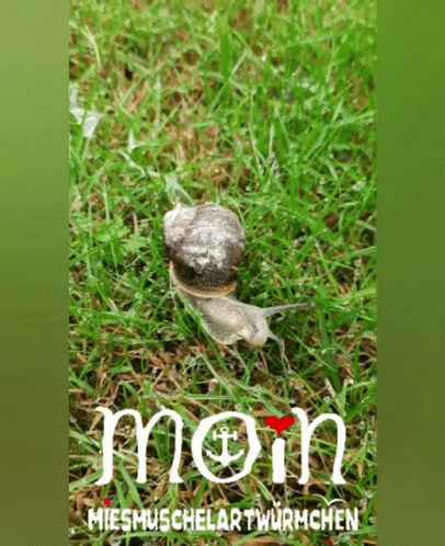 A snail slowly crawls through dewy green grass, accompanied by the German greeting 'moin' and 'Miesmuschelartwürmchen'.