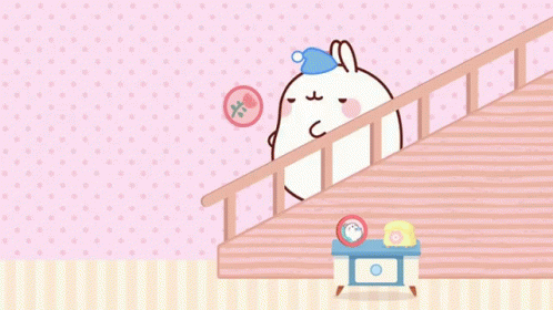 Molang, wearing a blue sleep cap, yawns and stretches as it walks down the stairs in a pink room, ready to start the day.