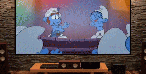 Gutsy Smurf and Brainy Smurf happily dancing together in a colorful cartoon scene.