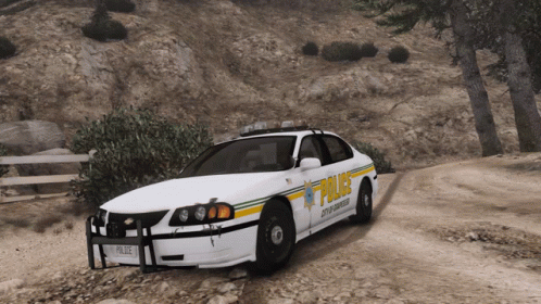 A white GVPD ARP police Impala, likely from GTA 5, parked on a dirt road in a scenic, hilly area.