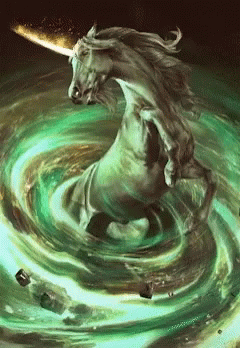 A majestic Gwent unicorn card emerges from a swirling vortex of green light and cosmic dust.