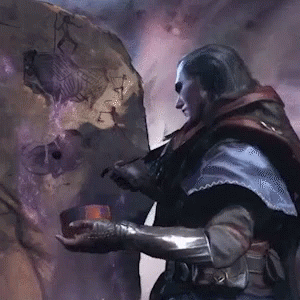 Avallach, a character from Gwent, is depicted creating ancient glyphs on a glowing stone slab.