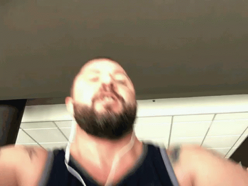 A bearded man wearing earbuds runs on a treadmill at the gym, making an intense or funny face during his workout.