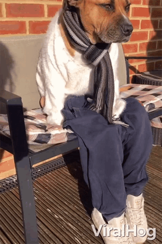 H2di the dog, dressed in a cozy sweater, scarf, beanie, and pants, sits stylishly on a bench.