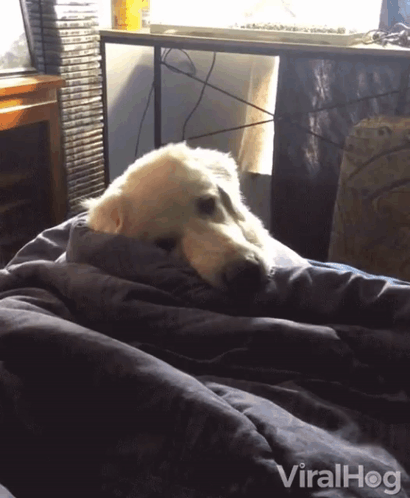 A cute white dog peeks out from under a cozy dark grey blanket before slowly pulling its head back in to snuggle down.