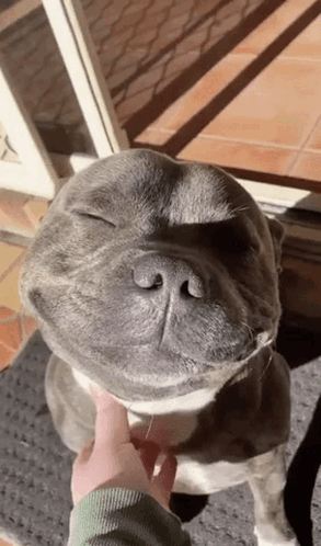 A happy dog closes its eyes and smiles blissfully as it receives gentle pets under its chin.