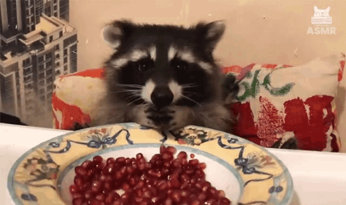 A cute raccoon, H2di, enjoys eating pomegranate seeds from a plate with its tiny paws.