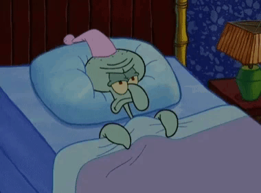 Squidward from Spongebob Squarepants is in bed, looking angry and unable to sleep, wearing a nightcap.