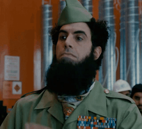Admiral General Aladeen from The Dictator adjusts his military uniform and prominent beard.