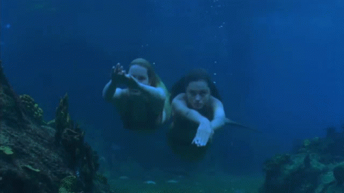 Two mermaids from H2o swim gracefully underwater, exploring the ocean and interacting with each other.