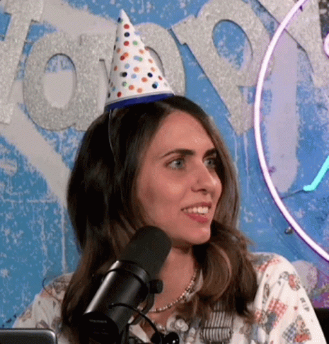Hila Klein wearing a polka dot birthday hat and speaking into a microphone.