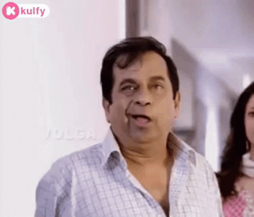 Brahmanandam makes a funny, exaggerated laughing face in a plaid shirt from Baadshah movie.
