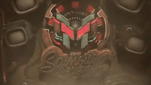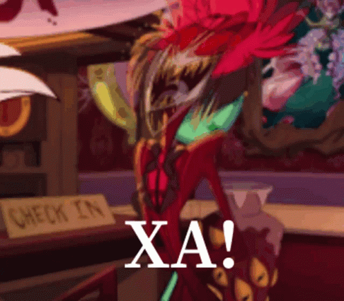 Alastor from Hazbin Hotel stands by a check-in sign, appearing to make a sound.