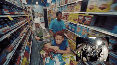 Children grocery shopping in a supermarket, inspired by Bad Bunny's 'Hablamos Manana' music.