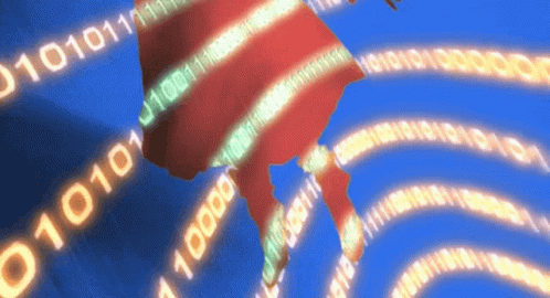 Tsukasa's silhouette, filled with red stripes, moves against a swirling blue background of binary data from .hack//Sign.