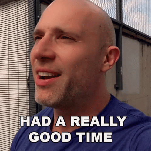 Simon Miller, a bald man in a blue shirt, smiles and says 'Had A Really Good Time' outdoors.