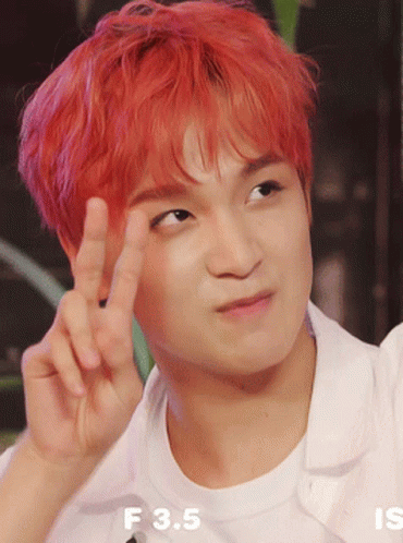 Haechan shows off his funny and cute expressions, first squinting and pointing, then smiling broadly with red hair.