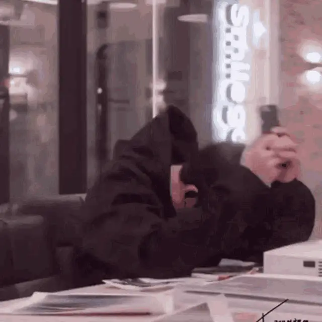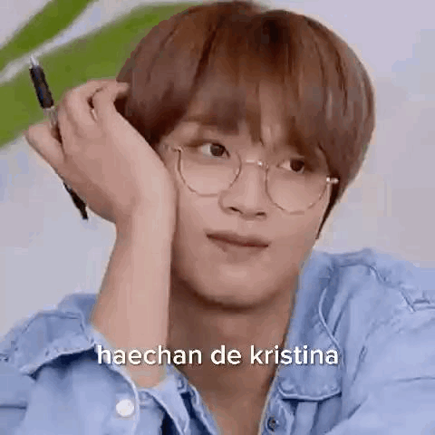 Haechan, a young man wearing glasses, holds a pen to his ear with a thoughtful expression.
