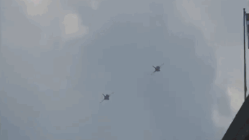 Two Hellenic Air Force F-16 fighter jets perform a close formation flyby past a building with a Greek flag.