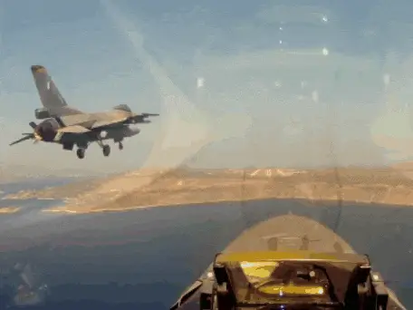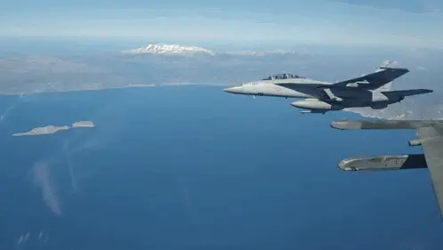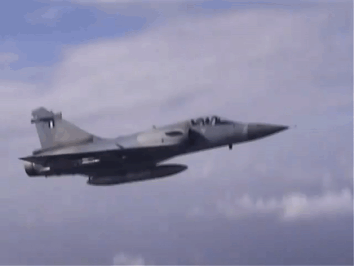 Hellenic Air Force Mirage 2000 fighter jet deploying its airbrakes while flying through the sky.