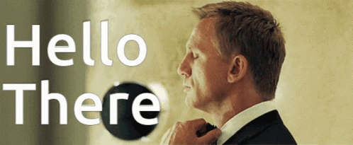 Daniel Craig as James Bond adjusts his tie, with 'hello there' text visible.