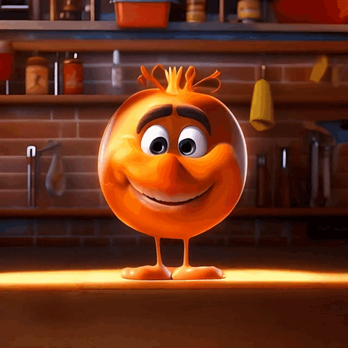 Animated orange character with a wide smile laughs joyfully in a kitchen setting.