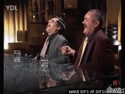 Two men, one with curly hair and another with a mustache, laugh hysterically at a table.