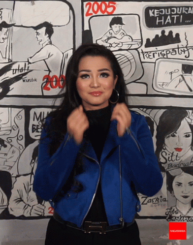 Fitri Carlina playfully laughs and acts shy in a blue jacket, standing against a comic-style wall.