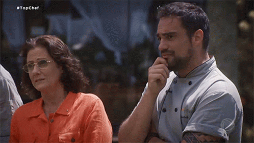 A man and woman from Top Chef Brasil share a laugh, with the man covering his face in amusement.