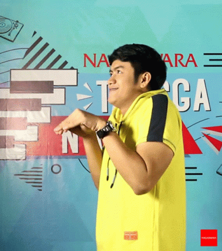 A man in a yellow shirt, identified as Denias, makes funny and silly expressions in front of a Nagaswara sign.