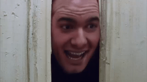 Man with wide eyes and a big smile peeks through a door crack, creating a humorous or startling moment.