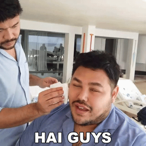 Indonesian celebrity Ivan Gunawan greets viewers with "Hai Guys" while another man wipes his face.