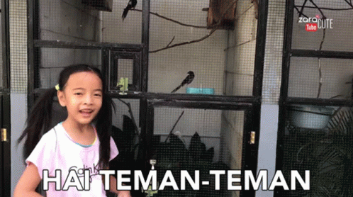 Zara Cute enthusiastically greets her friends, saying 'Hai Teman-Teman!' in front of a bird cage.