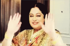 Kirron Kher smiles and waves warmly at the camera, wearing elegant gloves in a Bollywood-inspired moment.