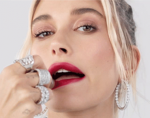 Hailey Bieber applies vibrant red lipstick, showcasing her makeup routine with elegant hoop earrings.