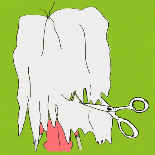 Animated drawing of a person with long, white, flowing hair being cut by scissors against a green background.
