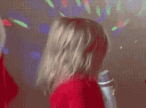 A little girl with blonde hair dramatically flips her hair while holding a microphone on stage.