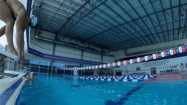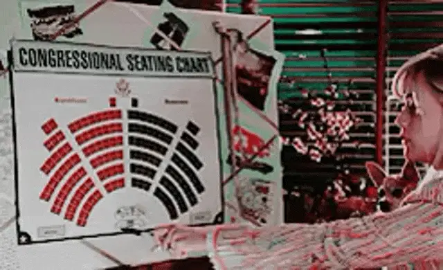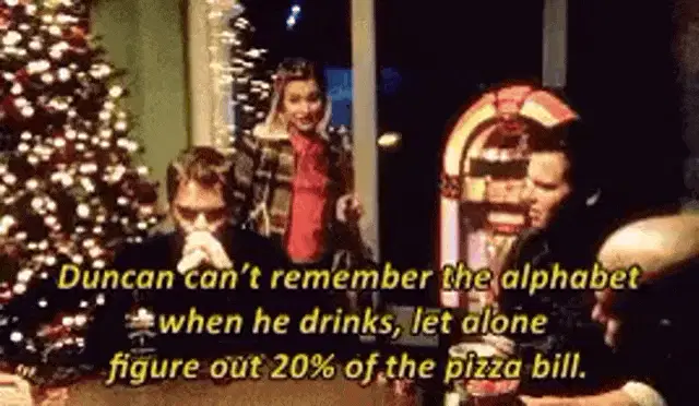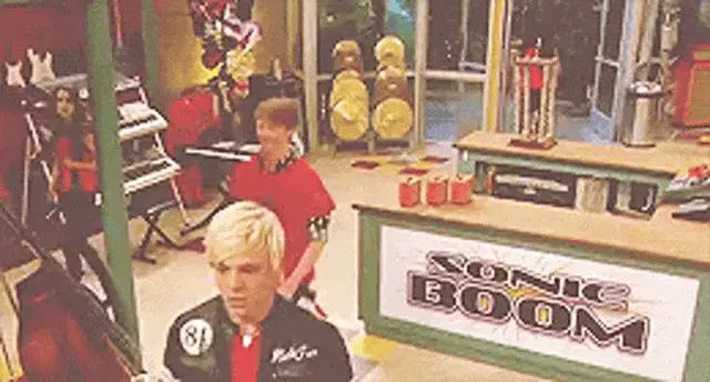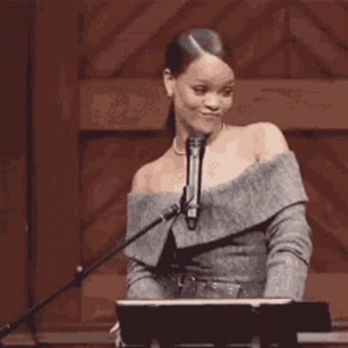 A woman behind a microphone and piano makes a playful expression, then confidently flips her hair.
