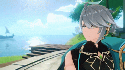 Al Haitham from Genshin Impact, a character with gray hair and blue eyes, looking out at the sea.