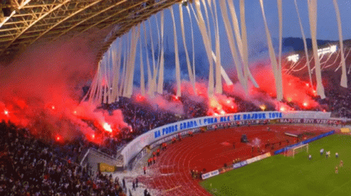 Hajduk Split fans, Torcida, ignite a spectacular flare show with streamers at Poljud Stadium.