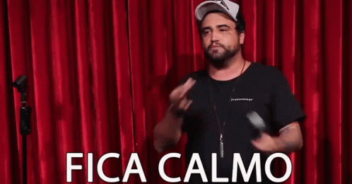 Hallorino Jr demonstrates how to 'Fica Calmo' (Stay Calm) in front of a red curtain.