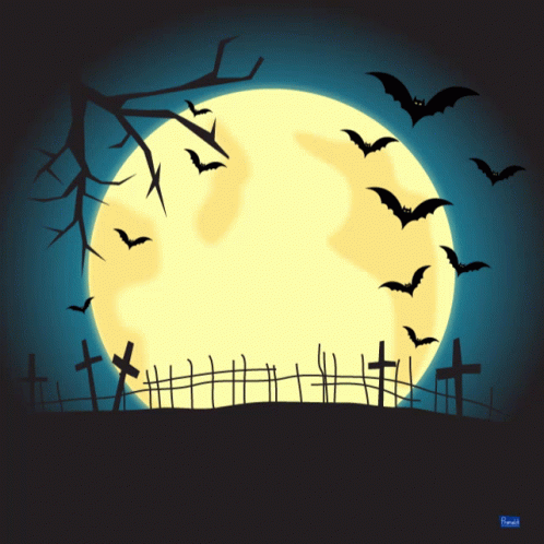 Spooky Halloween illustration featuring a carved jack-o'-lantern, bats, and a full moon over a graveyard.