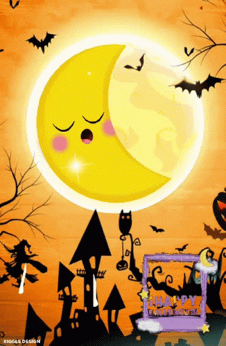An animated Halloween graphic featuring a sleeping crescent moon, flying bats, and cute ghosts, wishing a Happy Halloween.