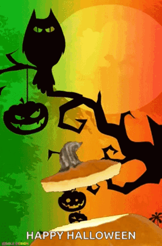 Spooky Halloween scene with a black cat, jack-o'-lantern, and a large pumpkin with a witch hat.