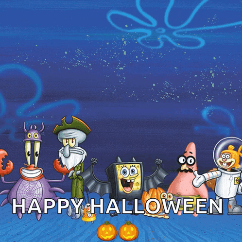 SpongeBob SquarePants and his friends, including Patrick, Squidward, Mr. Krabs, and Sandy, celebrate Halloween in costumes.