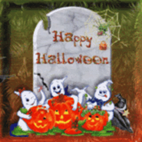 Festive Halloween wallpaper featuring ghosts, jack-o'-lanterns, a witch, and a gravestone with 'Happy Halloween'.